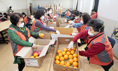 동작복지재단 직원들과 자원봉사자들이 27일 서울 동작구 동작자원봉사센터에서 코로나19 장기화로 생계가 어려운 저소득층에 전달할 식료품 사랑의 꾸러미를 포장하고 있다.