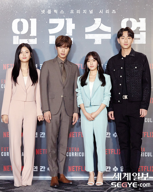 배우 박주현, 김동휘, 정다빈, 남윤수(사진 왼쪽부터)가 28일 오전 온라인 생중계로 진행된 넷플릭스 오리지널 시리즈 '인간수업' 제작발표회에 참석해 포토타임을 갖고 있다.