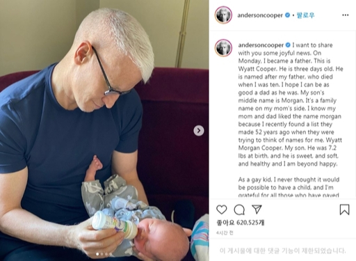 미국 CNN방송의 간판 앵커인 앤더슨 쿠퍼(52)가 30일(현지시간) 득남 소식을 전했다.