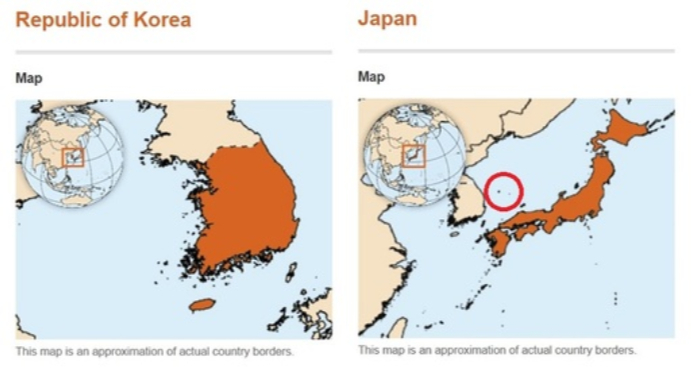14일 사이버 외교 사절단 반크 등에 따르면 이날 WHO 홈페이지 주요 메뉴 중 국가정보 서비스(country)를 선택해 우리나라와 일본 지도를 확인하면, 독도와 울릉도가 작게나마 표시된 일본과 달리 우리나라 지도에는 두 섬 모두 등장하지 않는다.