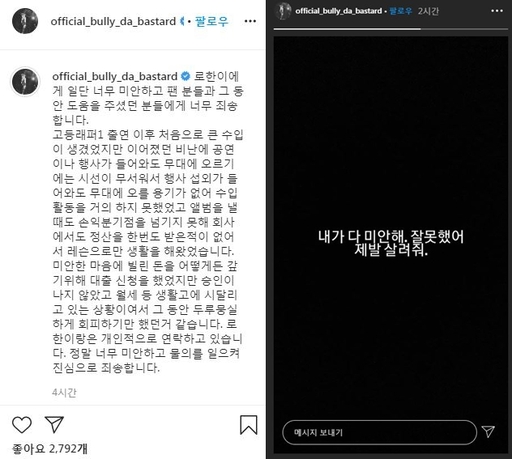 이어 “로한이랑은 개인적으로 연락하고 있다. 정말 너무 미안하고 물의를 일으켜 진심으로 죄송하다”라고 재차 사과했다.