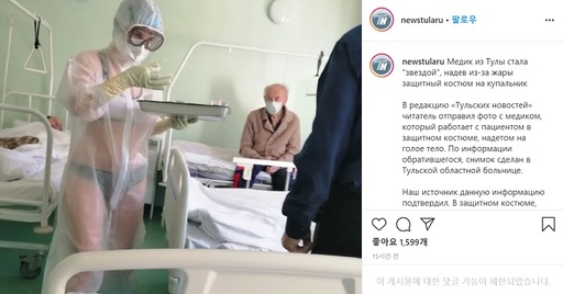 신종 코로나바이러스 감염증(코로나19) 환자를 치료하는 러시아의 한 의료진이 투명 보호복 안에 비키니를 받쳐 입은 채로 현장에 나와 보건당국으로부터 ‘과다 노출’에 따른 징계를 받았다.