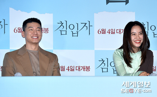 배우 김무열(왼쪽)과 송지효가 27일 오후 서울 용산 CGV에서 열린 영화 '침입자'의 언론시사회에 참석해 대화를 나누고 있다.