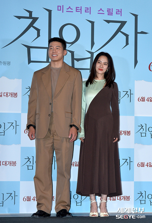 배우 김무열(왼쪽)과 송지효가 27일 오후 서울 용산 CGV에서 열린 영화 '침입자'의 언론시사회에 참석해 포즈를 취하고 있다.
