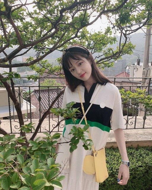 이유비는 5일 인스타그램에 공개한 사진에서 전망이 좋은 전원 주택가의 깜찍한 포즈를 취하고 있다.