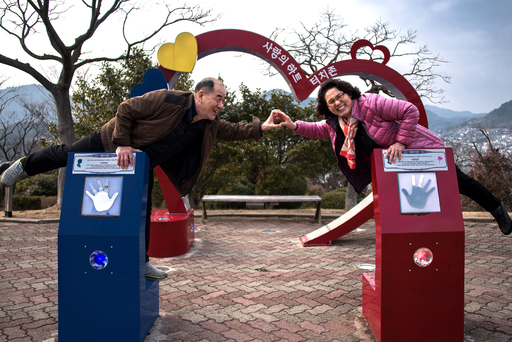 사랑만들기 알아보기 기계 앞에서 부부가 밝은 모습으로 하트를 만드는 모습.