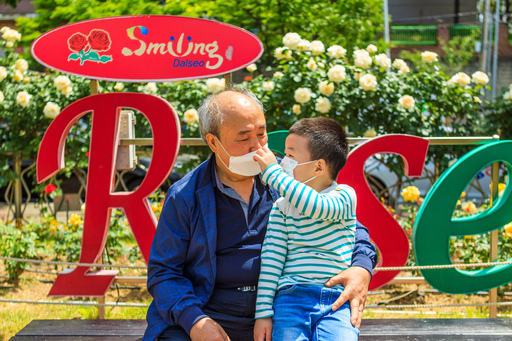 장미가 활짝 핀 공원의 벤치에서 할아버지의 잘못된 마스크 착용을 바로 잡아주는 손자의 귀여운 효·사랑의 모습.