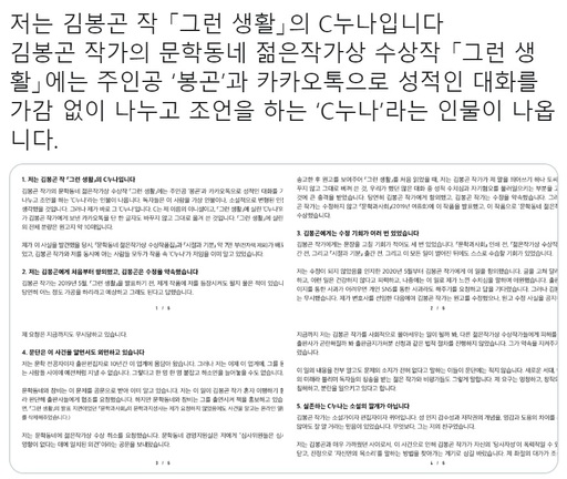 한편, 문학동네는 전날(13일) 공식 트위터에 올린 입장문에서 “‘그런 생활’과 관련한 문제를 접하고 수정 내용을 신속히 작품에 반영했다”고 해명했다. 특히 김 작가의 수상에 변동이 있을지 심사위원들에게 물어본 결과 “심사위원들은 해당 내용이 전체 작품을 판단하는 데 결정적인 요소가 아니라는 의견을 보내왔다”고 설명했다.