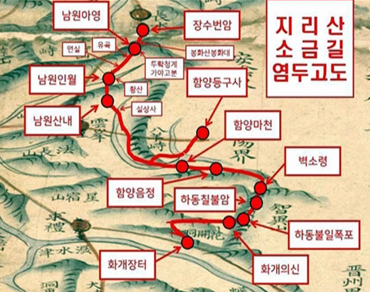 이 길은 소금과 콩의 이름을 따 ‘염두고도(鹽豆古道)’로도 불렸다. 지금도 지리산 뱀사골 계곡 간장소와 가야고분군이 집성한 두락마을 소금장수무덤 등에 흔적으로 남아 있고 하동댁과 운봉댁의 소금장수 이야기 등에 사연이 깃들어 있다.
