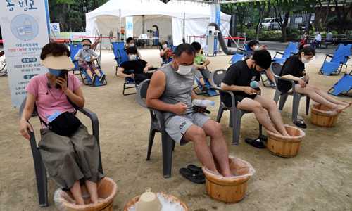 20일 서울 동작구 노량진근린공원에 마련된 ‘무더위 쉼터’에서 시민들이 얼음족욕을 즐기고 있다.