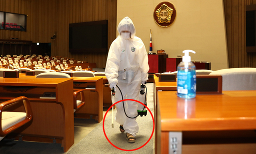 국회사무처가 지난달 27일 배포한 사진에 따르면 방역인력이 방역복을 입고 국회 본회의장 등 곳곳을 방역했다. 그런데 한 사진을 보면 방역인력이 맨발에 샌들을 신었다. 예방 차원의 방역이라면 문제가 안 될 수 있는데 확진자가 다녀간 장소는 사정이 다르다. 방역업계 관계자는 이날 세계일보 통화에서 “코로나19 확진자 나온 곳의 방역은 방역화에 덧신까지 착용해야하는데 국회 방역한 사진을 보다가 너무 놀랐다”며 “3일 또 확진자가 나왔다고 하는데 방역에 각별히 유의해야할 것 같다”고 지적했다.