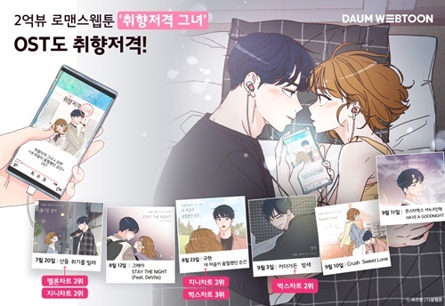 ‘취향저격 그녀’ 인기는 웹툰을 넘어 OST 음원 시장에서도 두각을 드러내고 있다. 드라마를 방불케 하는 화려한 뮤지션 라인업은 물론, 두 주인공의 로맨스를 떠올리는 가사와 멜로디를 담아 선보인 6곡의 OST 모두 화제를 모으며 각종 음원 사이트 상위권을 휩쓸었다. 웹툰 한 작품이 6곡 이상의 OST를 선보인 것 역시 이례적이다.