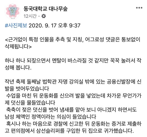 지난 17일 동국대 대나무숲에서 글쓴이는 “작년 축제 둘째 날 법학관 자명 강의실 밖에 있는 공용신발장에 신발을 벗어두었다. 수업을 마친 뒤 운동화를 신으려 발을 넣었는데 차가운 무언가가 느껴졌다”고 말문을 뗐다.