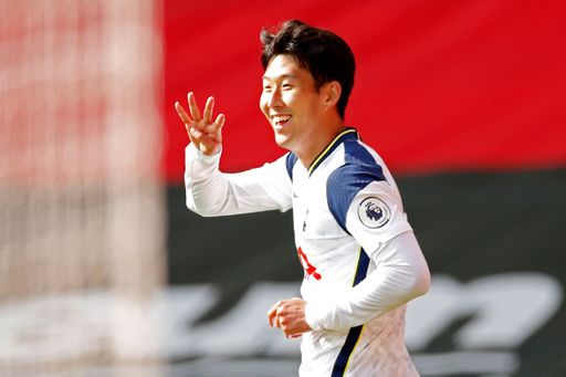 토트넘 손흥민이 20일 영국 사우샘프턴 세인트 메리스 스타디움에서 열린 프리미어리그 2라운드 사우샘프턴과의 경기에서 해트트릭을 넘어 네 번째 득점을 뽑아낸 뒤 손가락으로 ‘4골’을 표시하며 활짝 웃고 있다. 프로축구 빅리그에서 한국 선수가 한 경기에서 4골을 터뜨린 것은 손흥민이 처음이다.