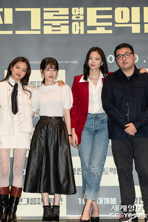 배우 고아성, 박혜수, 이솜, 이종필 감독(사진 왼쪽부터)이 28일 오후 온라인 생중계로 열린 영화 '삼진그룹 영어토익반' 제작보고회에서 포토타임을 갖고 있다.
