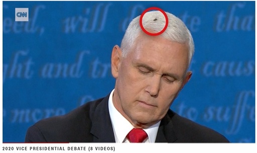 유타주 솔트레이크시티에서 열린 미국의 마이크 펜스 부통령과 카멀라 해리스 민주당 부통령 후보의 TV 토론 중, 펜스 부통령의 ‘설원’ 같은 흰머리에 까만 파리 한 마리가 앉아 시청자들의 시선을 강탈한 거다.