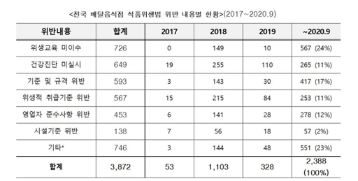 그러나 배달음식점의 식품위생법 위반 건수는 2017년 53건, 2018년 1103건, 2019년 328건 등이었다.