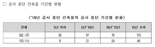 공사 중단 기간으로 보면 15년 초과인 곳이 153곳으로 절반에 가까웠으며, 10~15년(76곳), 5~10년(67곳), 5년 이하(26곳)으로 조사됐다.