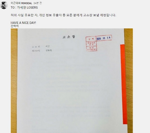 이근 전 대위는 14일 유트브 채널에 “TO : 가세연 루저스(LOSERS·패배자들). 허위 사실 유포한 자, 개인 정보 유출자 등 모든 분에게 고소장 보낼 예정입니다”라며 “해브 어 나이스 데이(HAVE A NICE DAY(즐거운 하루 보내세요)!”라는 글과 사진(위)을 게재했다.