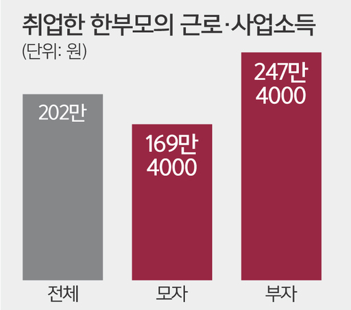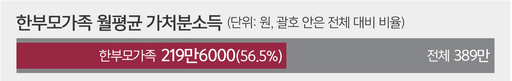 지난해 여성가족부가 발표한 ‘2018년 한부모가족 실태조사’는 한부모가족이 양육에 얼마나 취약한 상태인지를 보여준다. 한부모가정의 세금과 사회보험료 등을 제외한 월평균 가처분소득은 219만6000원으로 이는 전체 가구 평균(389만원) 대비 56.5% 수준에 그쳤다. 직전인 2015년 조사 결과(58.0%)보다도 상대적으로 더 어려워진 상황이었다.