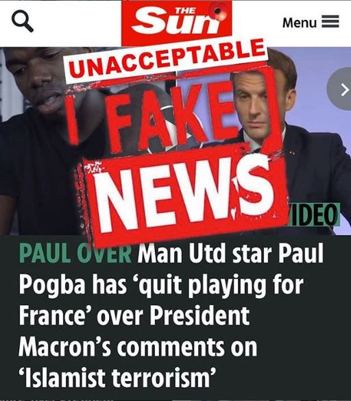 포그바는 지난 26일(한국시간) 오후 인스타그램에 ‘에마뉘엘 마크롱(오른쪽) 프랑스 대통령의 이슬람 테러 관련 발언을 들은 포그바가 국가대표 은퇴를 고려하고 있다’라는 제목의 기사 캡처본(위)과 함께 “근본 없는 뉴스다”라며 “나는 그런 말을 한 적이 없다”고 비판했다.