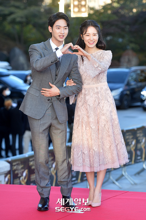 배우 장동윤, 방송인 장예원이 28일 오후 서울 동대문구 회기동 경희대학교 평화의전당에서 진행된 2020 대한민국 대중문화예술상 레드카펫에 참석해 포즈를 취하고 있다.