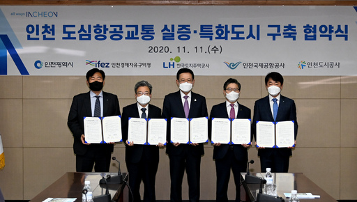 인천공항공사는 11일 송도국제도시 G타워에서 인천시, 한국토지주택공사, 인천경제자유구역청, 인천도시공사 등 4개 기관이 참여한 가운데 ‘인천 도심항공교통(UAM) 실증·특화도시 구축 협약’을 체결했다.