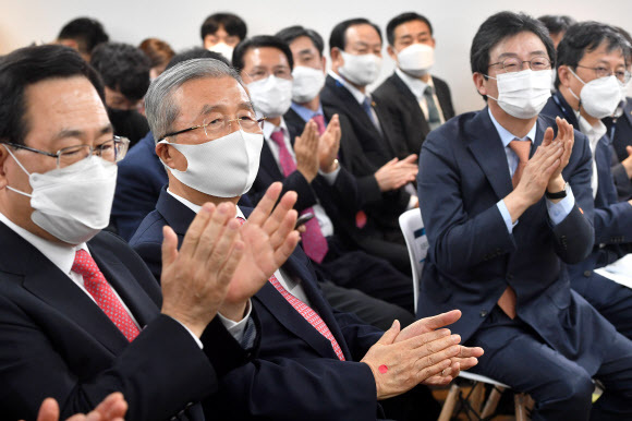 16일 서울 여의도 국회 앞 태흥빌딩에 마련된 유승민 전 의원의 ‘희망 22’ 사무실에서 열린 토론회에서 국민의힘 김종인 비대위원장과 주호영 원내대표, 유승민 전 의원 등 참석자들이 박수를 내빈 소개를 들으며 박수치고 있다. 공동취재사진