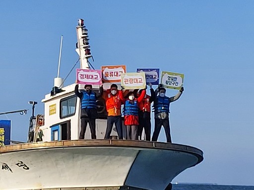 지난 28일 오후 경북 포항시 영일만 앞 바다에서는 쌀쌀한 날씨에도 불구하고 동해안대교 건설을 요구하는 해상 퍼레이드가 펼쳐졌다.