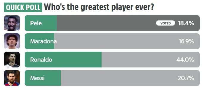 이 투표에서 44%를 받으며 1위에 오른 호날두는 20.7%, 18.4%, 16.9%를 기록한 메시, 펠레, 마라도나를 앞서고 있다.