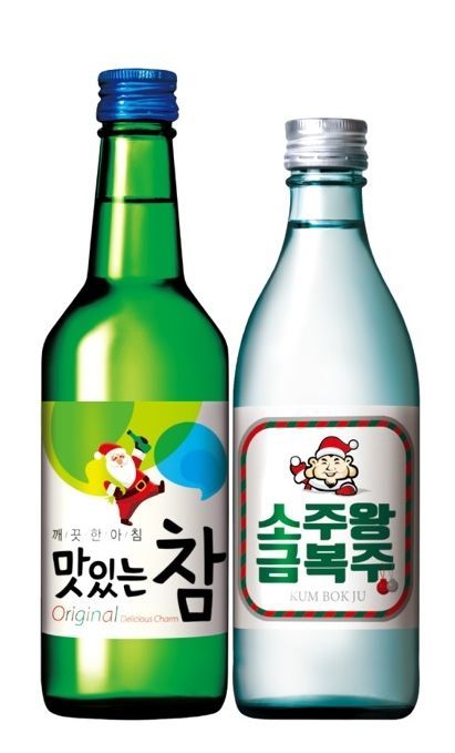 ‘맛있는참’(용량360㎖) 병에는 산타클로스가 선물꾸러미와 함께 소주병을 든 모습이, ‘소주왕금복주’에는 캐릭터 소주왕이 산타클로스 복장으로 웃는 모습이 새겨졌다.