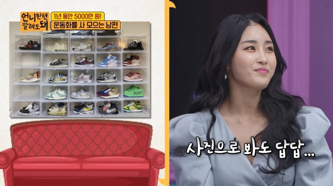 송아름은 “운동화를 그만 사라고 말려도 내가 벌어서 내가 사는 건데 뭐 어떠냐고 큰 소리를 친다”며 “고가의 운동화를 살 거면 상의라도 해주면 좋겠다”고 고민을 털어놓았다.