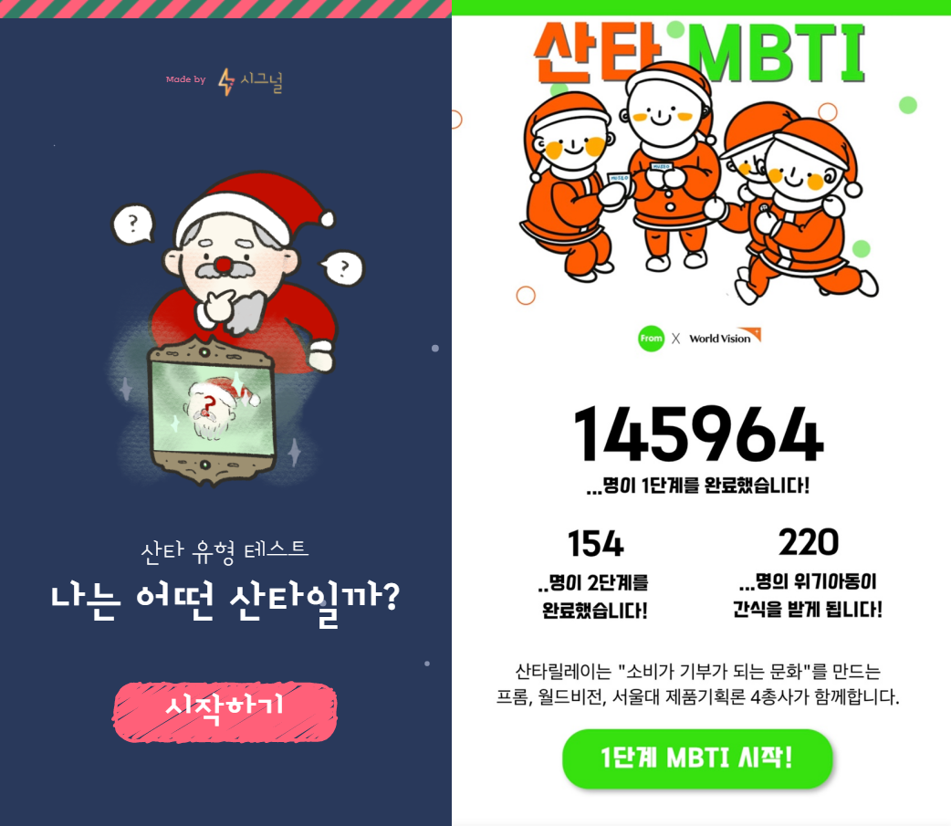 한편 시그널에서 제작한 ‘산타 유형 테스트’는 ‘드디어 선물 배달이 끝난 12월26일! 만약 내가 산타라면?’, ‘나는야 루돌프! 배달 도중 헷갈리는 길이 나왔다면?’ 등 12개의 문항에 차례대로 대답하면, 자신이 어떤 산타인지 결과를 확인할 수 있다. 해당 테스트에서는 본인의 성향과 맞는 산타와 맞지 않는 산타를 함께 알려줘 재미를 더한다.