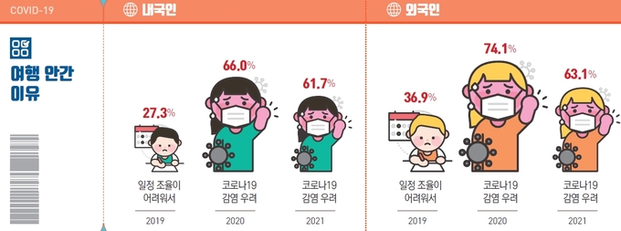 국내여행을 선택하는 이유에 대해서는 내국인의 경우 2019년에는 ‘경제적 부담이 적어서’라고 응답한 비율이 27.8%로 가장 높았으나 2020년에는 ‘해외 코로나19 감염 우려’라고 응답한 비율이 52.3%로 나타났다. 외국인들도 2019년에는 국내여행 선택 이유를 ‘아직 못 가본 국내 여행지를 경험하고 싶어서(40.2%)’로 꼽았으나 2020년에는 ‘해외 코로나19 감염 우려(53.1%)’, 2021년에는 ‘아직 못 가본 국내 여행지를 경험하고 싶어서(46.7%)’라고 답했다.