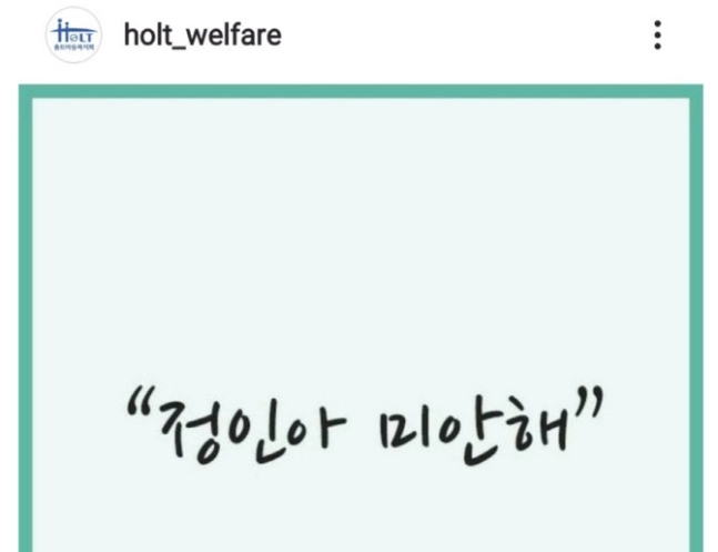 한편, 홀트 측은 최근 ‘정인아 미안해’ 챌린지 게시물을 내렸다. 홀트 측은 지난해 12월31일과 올해 1월2일 홈페이지와 인스타그램을 통해 ‘정인아 미안해’ 챌린지 참여 관련 글을 게재한 바 있다.
