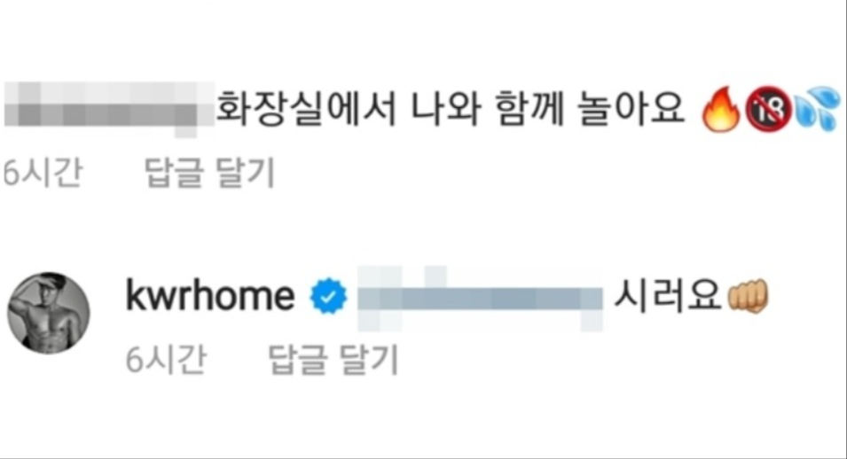 그러나 댓글창에 “화장실에서 나와 함께 놀아요”라는 내용과 함께 19금 표시의 이모티콘이 달리자 김우리는 “싫어요”라며 주먹 이모티콘을 달았다.