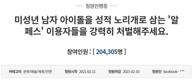 청원인은 “피해자가 여성이든 남성이든 권력을 가졌든 가지지 못했든 그 누구라도 성범죄 문화에 있어서는 성역이 될 수 없다”면서 “부디 적극적인 행정조치로 한시라도 빨리 ‘알페스’ 이용자들을 수사해 강력히 처벌해 달라”고 호소했다.