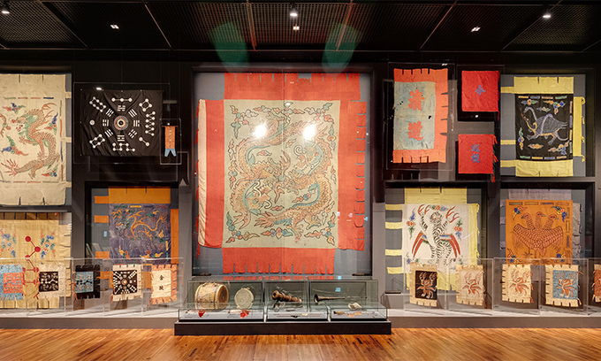 국립고궁박물관의 특별전 ‘조선 왕실 군사력의 상징, 군사의례’에서 가장 눈길을 끄는 건 갑주(갑옷과 투구)와 깃발이다. 용, 호랑이, 봉황 모양 등의 장식으로 꾸민 갑주 여러 벌을 칼, 창 등의 무기와 함께 전시해 조선판 ‘밀리터리 패션’의 ‘간지’를 제대로 보여준다. 전시장의 벽면 하나를 온전히 교룡기, 초요기 등의 군사용 깃발로 채운 것도 눈호강을 더한다.