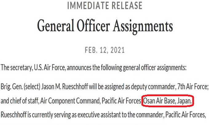 문제는 루쇼프 준장의 새 임지를 표기하는 과정에서 ‘공군오산기지, 일본(Osan Air Base, Japan)’이라고 잘못 적어 마치 오산기지가 일본에 있다는 식의 오해를 불러 일으킨다는 점이다. 미 태평양공군은 한국에 2개(오산·군산), 일본에 3개(가데나·요코타·미사와) 공군기지를 운영 중인데 아시아, 또는 한국을 잘 모르는 보도자료 작성자가 실수를 저지른 것으로 추정된다.