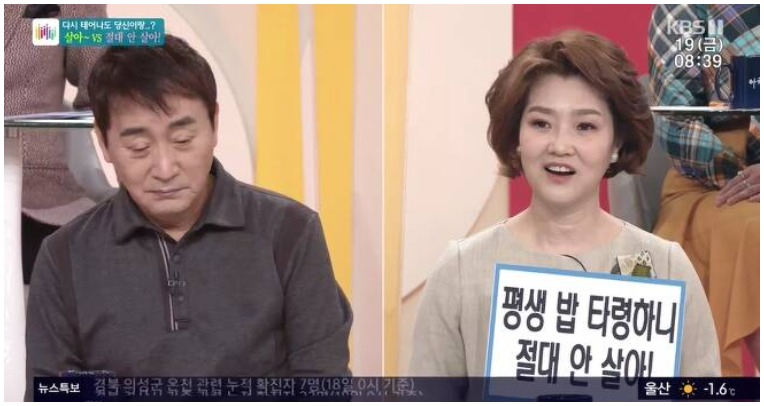 19일 방송된 KBS 1TV 시사교양 프로그램 ‘아침마당’ 생생토크 ‘만약 나라면’ 코너에서는 ‘다시 태어나도 당신이랑 살아VS절대 안 살아’ 주제로 대화가 진행됐다.