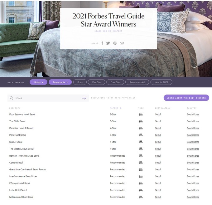 우리나라 호텔에 대한 포브스 여행안내서 평가는 전년과 동일하다. 온라인에서 확인한 결과 모두 13군데가 명단에 이름을 올린 상태다. 전통의 신라호텔과 대조적으로 짧은 역사를 지닌 포시즌스서울만이 파이브스타의 영예를 얻었다. 4성을 얻은 곳은 파라다이스시티와 파크하얏트서울, 시그니엘서울, 웨스틴조선이다. 추천 등급에는 반얀트리서울, 콘래드서울,그랜드 인터컨티넨탈 서울 파르나스, 인터컨티넨탈서울코엑스, 레스케이프, 롯데호텔서울, 밀레니엄힐튼서울이 포함됐다. 포브스 여행안내서에선 식당 평가도 중요한 비중을 차지하는데 국내 식당은 단 한 군데도 포함되지 않은 상태다. 스파의 경우 포시즌스호텔 스파가 4성으로 평가됐다.