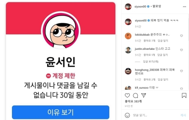 윤씨는 2일 자신의 인스타그램에 “페이스북 정지를 당했다”며 ‘30일 동안 게시물이나 댓글을 남길 수 없다’는 계정 제한 안내 메시지를 캡처한 사진을 게시했다.