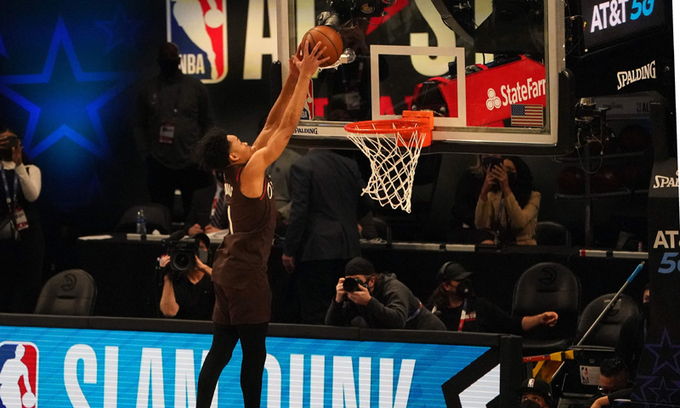 미국프로농구(NBA) 앤퍼니 사이먼스(포틀랜드)가 8일 미국 애틀랜타의 스테이트팜 아레나에서 열린 2020∼2021시즌 올스타전 덩크 콘테스트에서 엄청난 점프력을 과시하며 백보드 중간에서 공을 잡아 덩크슛을 시도하고 있다. 사이먼스는 이날 덩크왕에 올랐다. 이번 올스타전에서는 팀 르브론 제임스가 팀 케빈 듀랜트를 170-150로 꺾었고, 팀 르브론의 야니스 아데토쿤보(밀워키)가 최우수선수(MVP)에 선정됐다.