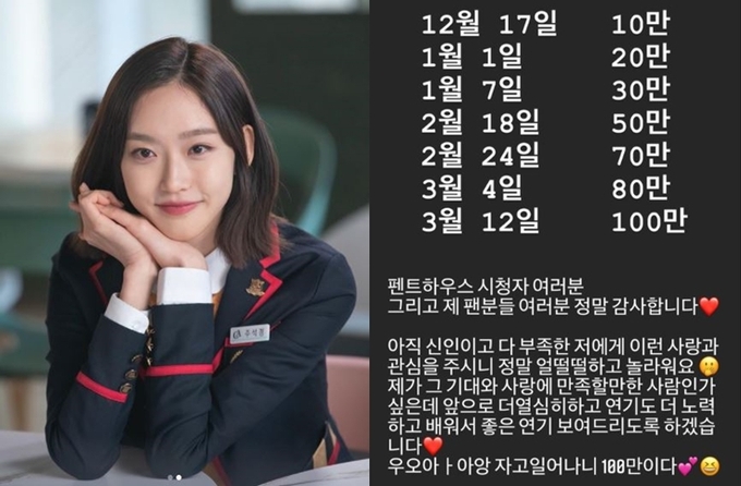 ‘펜트하우스2’에서 주석경 역으로 활약 중인 배우 한지현(24·사진)이 인스타그램 팔로워 100만 명 돌파를 자축했다.