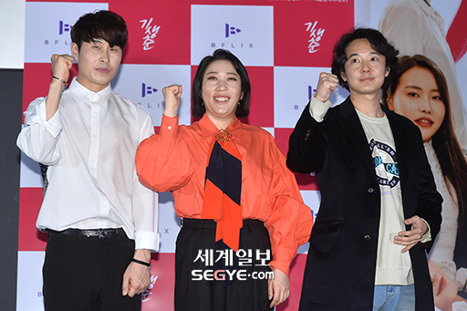 배우 민도윤, 김영희, 오동원(사진 왼쪽부터)이 24일 오후 서울 롯데시네마 건대점에서 열린 영화 ’기생춘’의 언론시사회에 참석해 포즈를 취하고 있다.