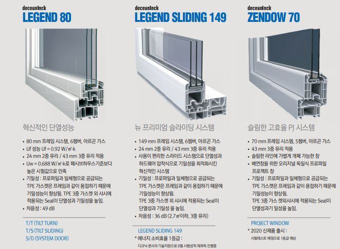 대표 모델인 ‘레전드 80(Legend 80)’ 시리즈는 6챔버 3중 가스켓으로 설계되었으며 이 모델에서 비롯된 ‘레전드 슬라이드 149(Legend Slide 149)’는 우리나라 특화 라인으로, 중앙으로부터 양쪽으로 개방이 가능한 것이 특징이다. 기존의 T/S, T/T 등 시스템창호 모델 사용이 낯선 국내 소비자들을 위해 개발된 제품으로 움직일 때는 익숙한 미닫이 방식을 차용하되 잠길 때에는 T/S 시스템창호의 원리를 적용해 편의성을 강화했다.