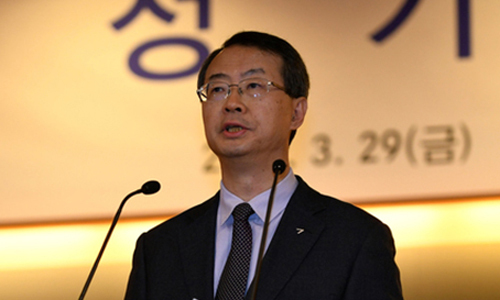 김수천 아시아나항공 전 대표이사가 지난 2019년 3월29일 오전 서울 강서구 아시아나항공 본사에서 열린 정기 주주총회에 참석, 인사말을 하고 있다. 뉴시스