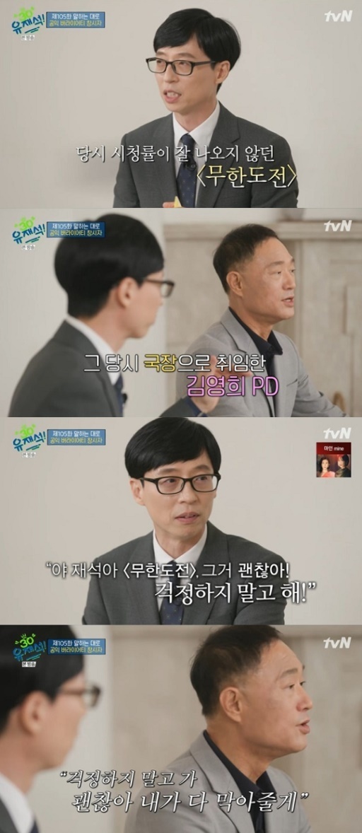 유재석은 “‘무한도전’ 시청률이 잘 안나왔다. 그런데 당시 김영희 국장님이 ‘재석아, 무한도전 괜찮아. 걱정하지 말고 해!’라고 말하셨다”고 밝혔다.
