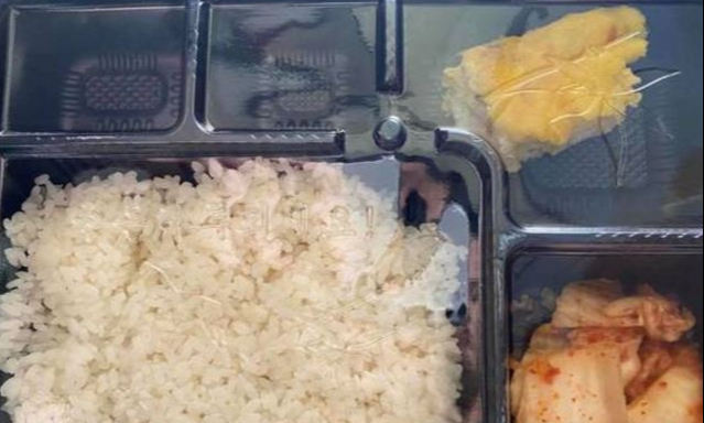 해당 사진에는 플라스틱 1회용 도시락 용기에 밥과 계란찜, 김치가 담겼다.