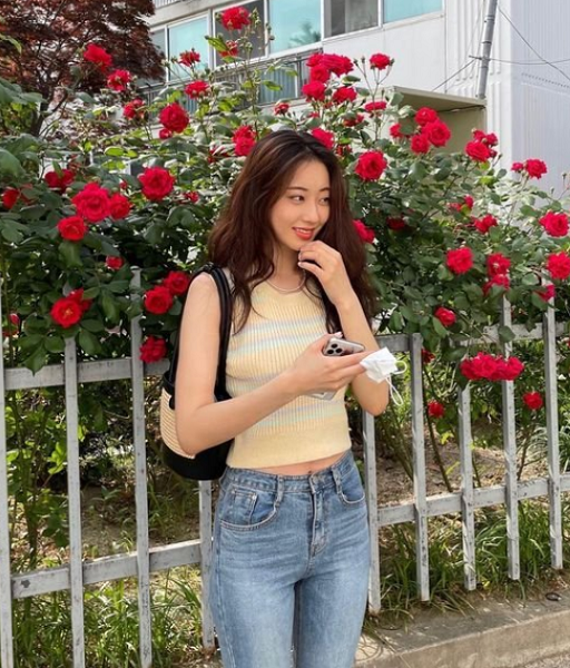 공개된 사진 속에서 경리는 아파트 앞에 핀 빨간 장미꽃을 배경으로 환한 미소를 짓고 있다. 청바지에 나시티를 입은 캐주얼한 모습에도 장미보다 아름다운 미모로 눈길을 사로잡는다.